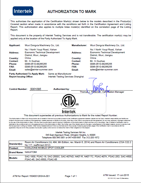 • 無(wú)錫冬夏機(jī)電有限公司近日宣布公司移動(dòng)式工業(yè)冷氣機(jī)獲得的質(zhì)量與安全第三方機(jī)構(gòu)天祥實(shí)驗(yàn)室(世界上規(guī)模的消費(fèi)品測(cè)試、檢驗(yàn)和認(rèn)證公司之一)頒發(fā)的ETL認(rèn)證。ETL是北美活力的安全認(rèn)證標(biāo)志,歷史可追溯到1896年托馬斯·愛(ài)迪生創(chuàng)建的電氣測(cè)試實(shí)驗(yàn)室,在···