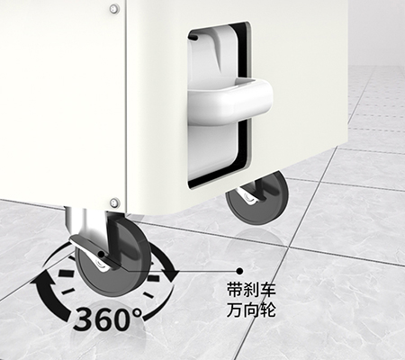 機(jī)器采用了帶有剎車的萬(wàn)向輪設(shè)計(jì),方便移動(dòng)到任意空間角落進(jìn)行使用。